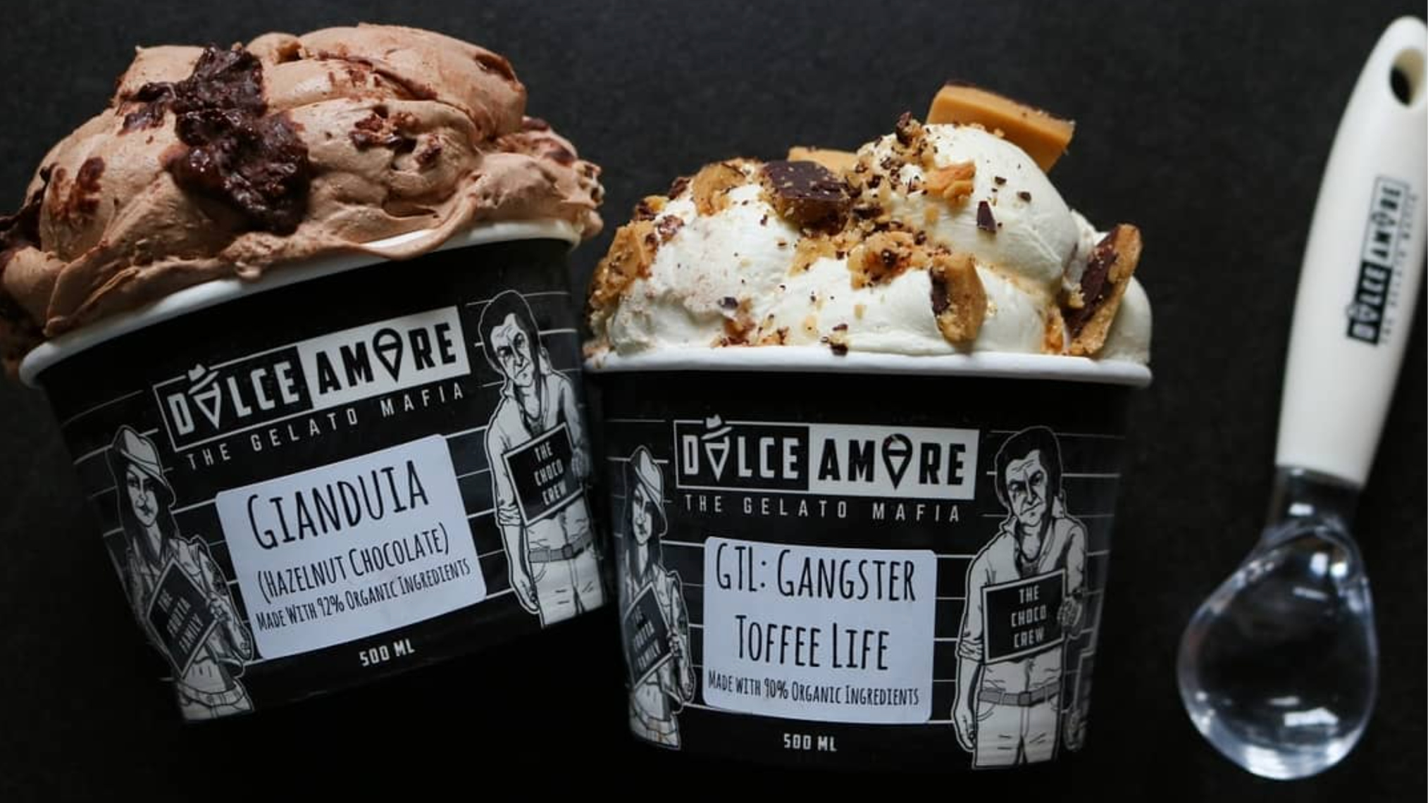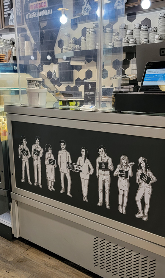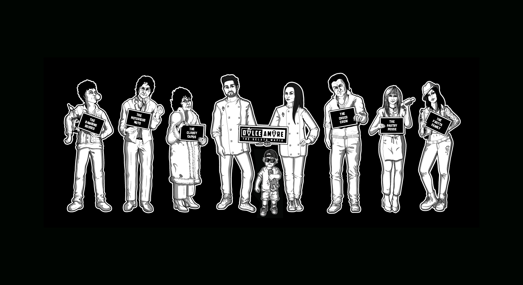 A set of illustrated portraits for a local gelato company, Dolce Amore, who playfully nicknames their collection of unique gelato flavours ‘The Gelato Mafia.’ The portraits are based on the owner’s family, transformed into the ‘Mafia' version of themselves. The illustrations are used on takeaway pint cups, and to accent the company’s rebrand. Made in association with creative studio Origami Social.
