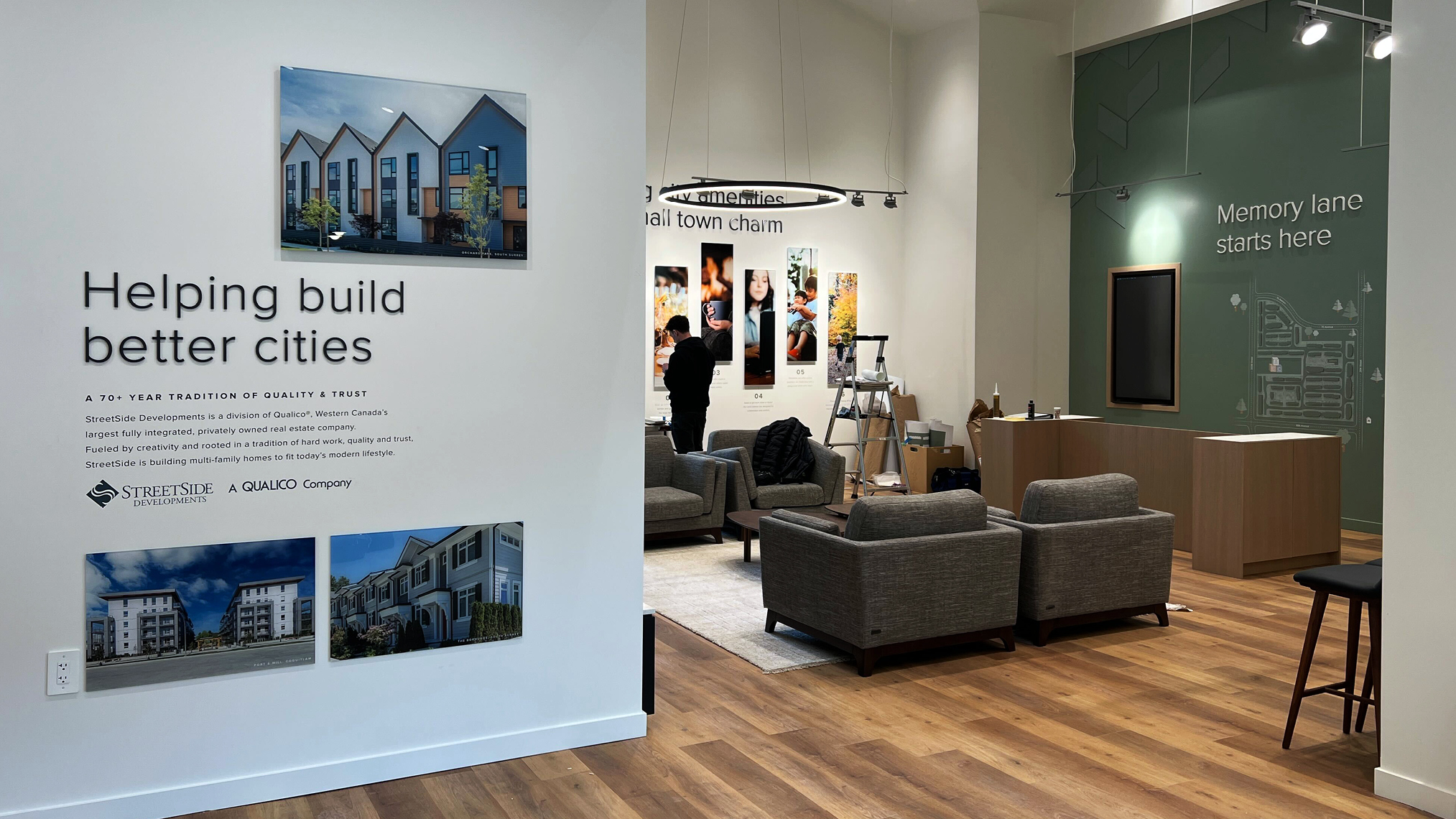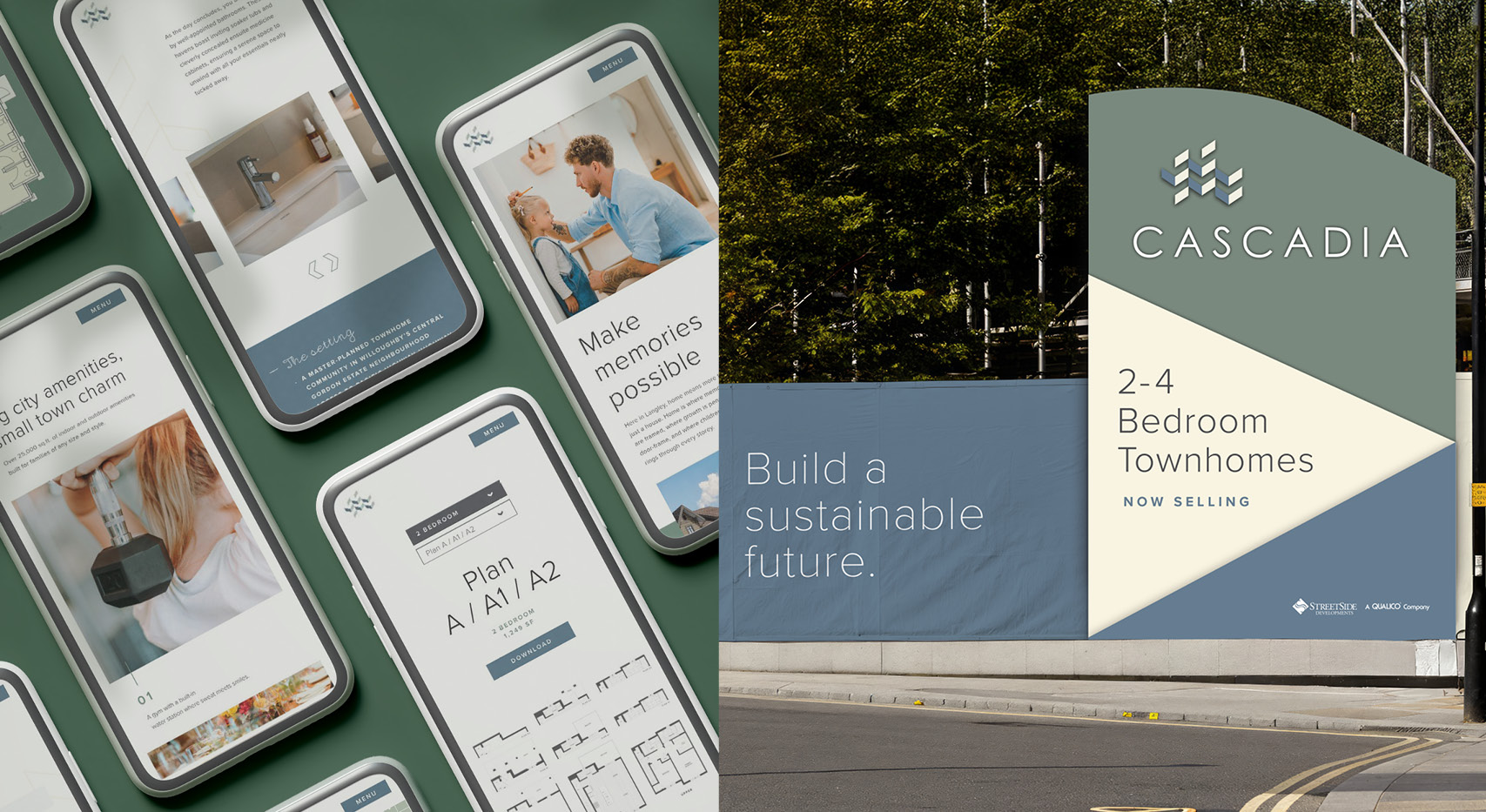 Evolution of the brand Cascadia, a Streetside Developments masterplan project in Langley, BC. With the logo & colour palette established, my role was to bring the brand to life through the signage, brochure, website, and advertising. Lots of physical pieces went into this project - we designed and produced construction hoarding, miscellaneous site signs, and interior graphics of the presentation centre. On the digital side, we were able to design the full website, PC touchscreen, and teaser advertising campaign. To promote their sustainability initiatives, an animated video was created to display in the PC.